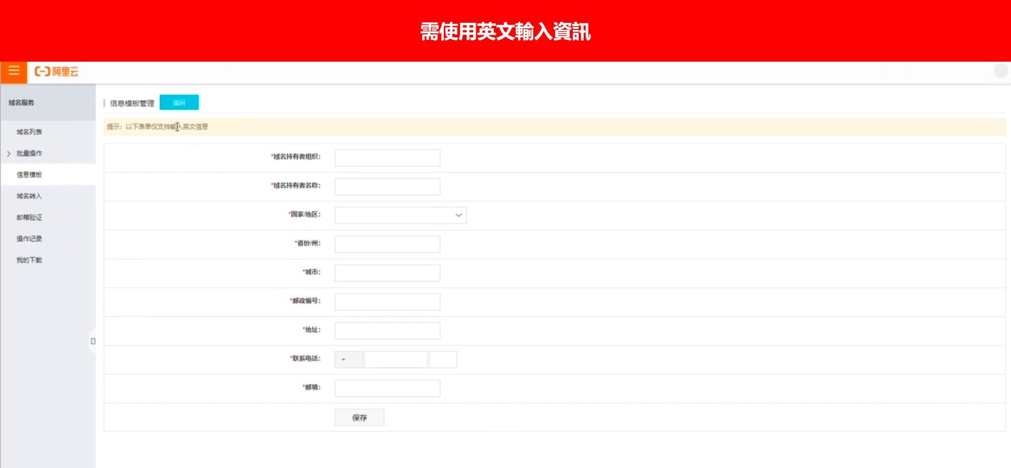 提醒!這邊需輸入英文資訊並按下保存回到上一頁(需等待系統審核預計2-3個工作天)