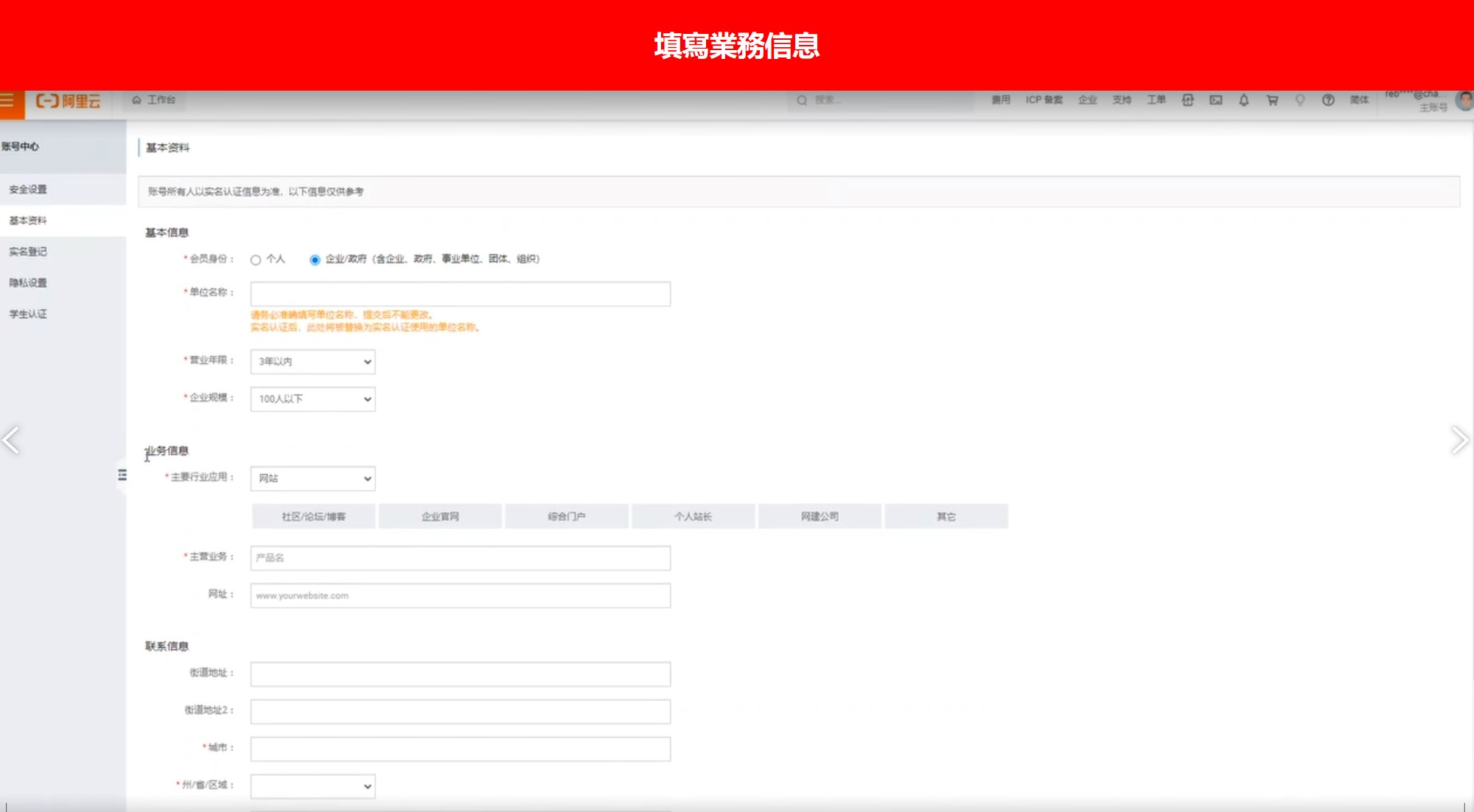 點選右上方頭像 → 基本資料 → 填寫業務信息