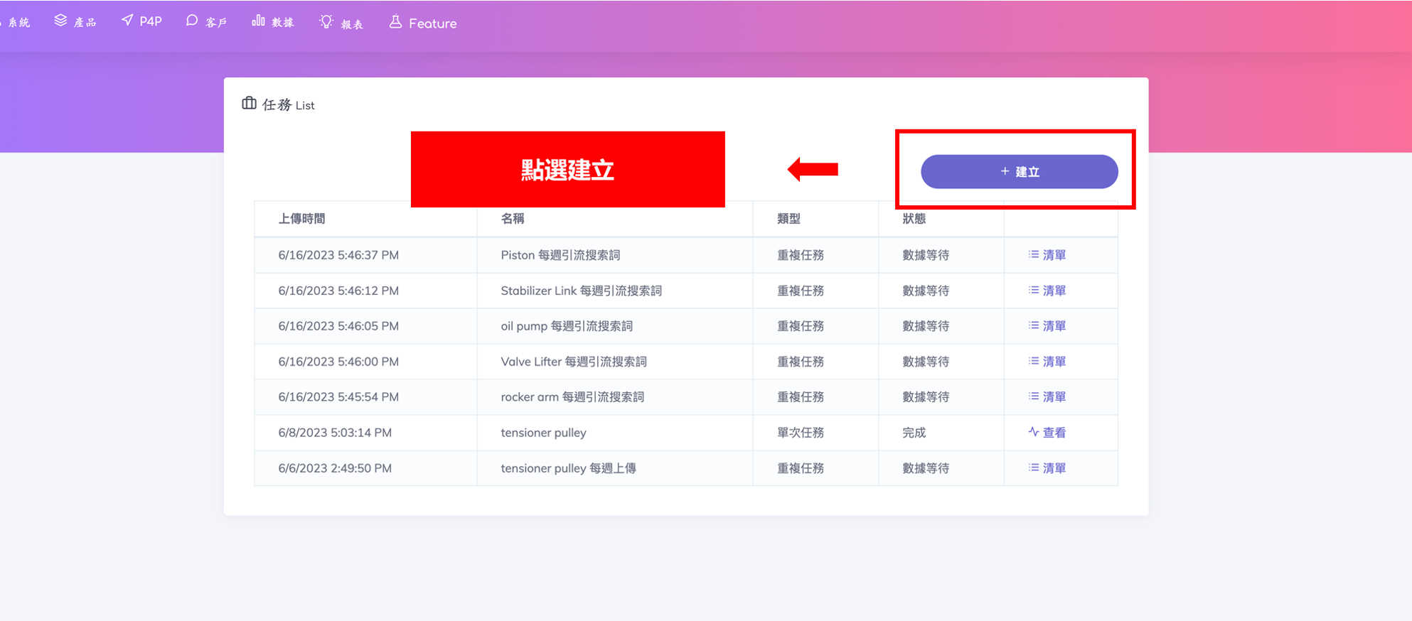 分為兩種類型,單次任務:自動找詞自動上架;連續任務:引流搜索詞上架,每週需上傳。