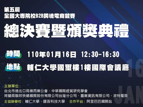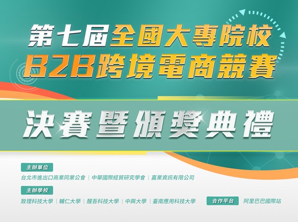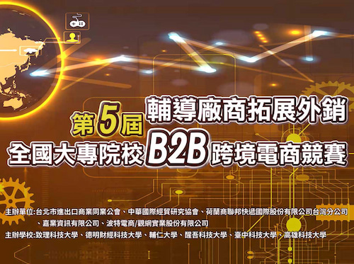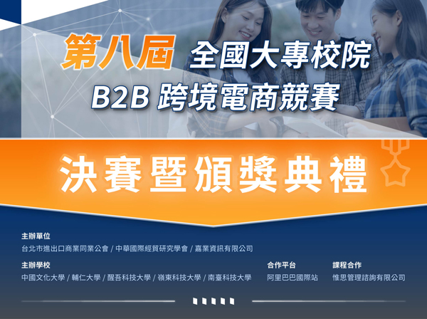 「第八屆全國大專院校B2B跨境電商競賽」全國決賽於1月6日選拔出最強電商冠軍隊伍,由中國文化大學拔奪頭籌,該競賽為台灣唯一全國性大學跨境電商競賽,屬實作實戰型非模擬競賽,由台北市進出口商業同業公會、中華國際經貿研究學會、Alibaba.com及嘉業資訊共同主辦,北中南五校包括中國文化大學、醒吾科大、輔仁大學、嶺東科技大學、南台科技大學等共同協辦。