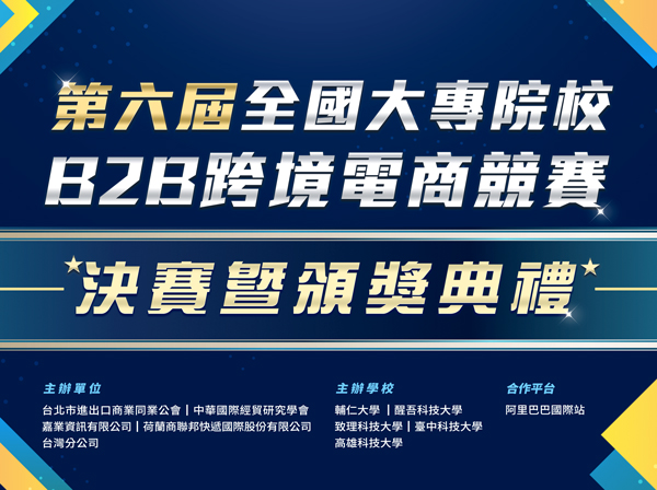 2022年01月15第六屆全國大專校院阿里巴巴跨境電商競賽已圓滿結束了,非常感謝所有參與競賽的廠商、同學、老師。主辦單位中包含:台北市進出口商業同業公會、中華國際經貿研究學會、嘉業資訊有限公司、荷蘭商聯邦快遞國際股份有限公司台灣分公司等,此次參與競賽的學校多達32所近500位學生所組成的隊伍為台灣外貿共同努力、一起接訂單!