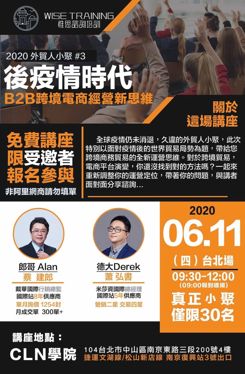第62期橙功營在2021年05月06日圓滿結束啦!透過阿里巴巴國際站三天兩夜的封閉式密集實戰課程本期共計47人參與,課程內容包含協助企業構建電商團隊,了解如何以客戶需求的視角經營電商,在大數據的幫助下尋獲新商機。課後將不定期舉辦講師與學員的聚會,將資源共享資源,讓大家在跨境電商領域持續精進!